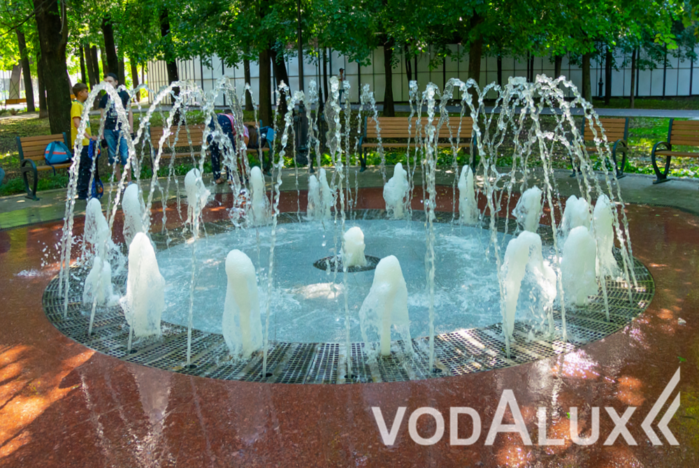 Круглая чаша диаметром 7 метров облицована двумя видами материалов: металлической решеткой и гранитными плитами. Водную композицию образуют пенные и одиночные струи, расставленные по краю фонтана и в центре.